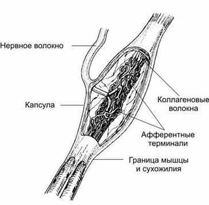 Сухожильные органы Гольджи (рис. 7–9) расположены в концевой части сухожилия на границе с мышцей, а также в связках капсулы суставов. Рецептор имеет веретеновидную форму и окружён капсулой, состоящей из нескольких слоёв плоских клеток. В образовании сухожильного органа Гольджи участвуют терминали афферентных миелиновых волокон, они ветвятся среди пучков спиралевидных коллагеновых волокон, расположенных в заполненном жидкостью пространстве.