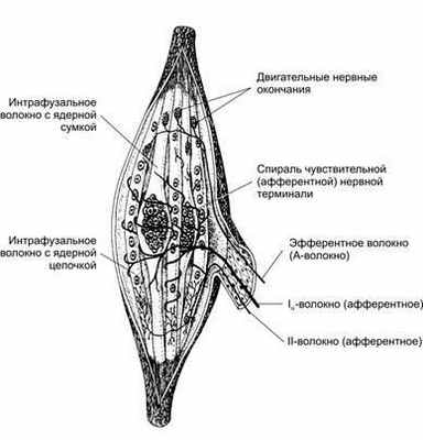 К мышечному веретену подходят афферентные и эфферентные нервные волокна. К ЯС-волокнам подходят миелиновые афферентные нервные волокна, образующие окончания аннулоспирального типа (первичные окончания). ЯЦ-волокна получают афферентную иннервацию как от того же первичного окончания, так и от более тонких афферентных волокон (вторичные окончания). Первичное окончание реагирует на степень и скорость растяжения мышц, а вторичное — только на степень растяжения. Импульсы по афферентным нервным волокнам поступают в спинной мозг, где афферентные нейроны передают их на гамма-мотонейроны.