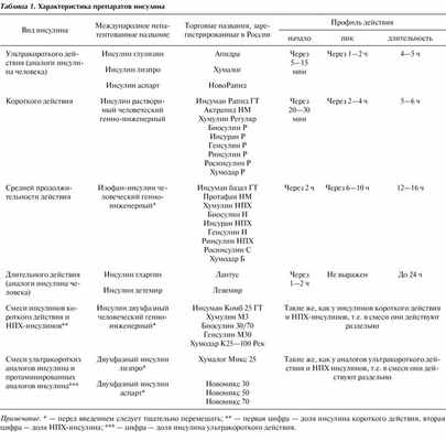 По источнику получения или видовой принадлежности препараты инсулина разделяются на животные, человеческие и аналоги инсулина человека. Человеческие инсулины получают генно-инженерным путем. По времени действия препараты инсулина разделяются на препараты ультракороткого действия, короткого действия, средней продолжительности действия и длительного действия. Действие препаратов человеческого инсулина удлиняет протамин. Наиболее часто используются препараты НПХ [7, 8]. Эти препараты можно стабильно смешивать с инсулином короткого действия, что используется при изготовлении фиксированных смесей. Смешанные инсулины практически не применяются для лечения СД 1-го типа. Параметры действия инсулинов отражены в табл. 1.