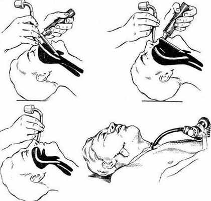 Врач держит ларингоскоп в левой руке, а пальцами правой руки открывает рот больного. Под визуальным контролем осторожно продвигают по спинке языка клинок ларингоскопа с зажженной лампочкой. Изогнутым клинком отжимают кверху (кпереди) корень языка, прямым клинком захватывают надгортанник и оттесняют его кверху, обнажая вход в гортань. Вслед за этим правой рукой быстро вводят в трахею интубационную трубку соответствующего размера.