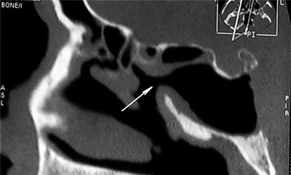 Послеоперационный период гладкий. На 5-й день произведен туалет оперированной полости под эндоскопическим контролем. Для лучшего осмотра оперированной полости также использована модель ULYSS. На 7-й день после операции отведение левого глаза восстановилось на 80%, исчезла головная боль. При эндоскопическом исследовании соустье клиновидной пазухи слева широкое, функционирует, что подтверждено данными КТ (рис. 3). Рисунок 3. Компьютерная томограмма ОНП (аксиальная проекция) больного Е. на 7-е сутки после операции по поводу грибкового тела. Воздушность клиновидной пазухи полностью восстановлена, естественное соустье пазухи достаточного размера (указано стрелкой), что обеспечивает адекватную аэрацию пазухи в послеоперационном периоде. Однако в связи с частичным разрушением канала левой внутренней сонной артерии пациенту рекомендовано динамическое наблюдение.