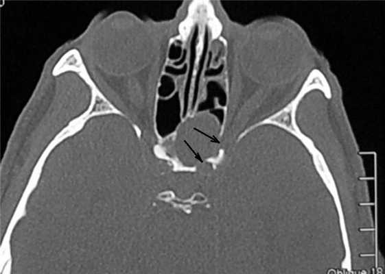 В рамках предоперационной подготовки для представления об объеме костной деструкции выполнена КТ околоносовых пазух. Обнаружена эрозия костного канала зрительного нерва слева, костного канала левой внутренней сонной артерии (рис. 1). Рисунок 1. Компьютерная томограмма ОНП (аксиальная проекция) больного Е. Затемнение обеих клиновидных пазух, дефекты костного канала зрительного нерва слева, костного канала левой внутренней сонной артерии (указано стрелками). Принято решение о необходимости эндоскопической сфеноидотомии с ревизией клиновидной пазухи и, при необходимости, удалении новообразования с последующим его гистологическим исследованием. Предоперационный диагноз: новообразование клиновидной пазухи. Паралитическое косоглазие слева.