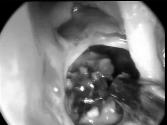 Произведена сфеноидотомия парасептальным доступом, при этом использовалась оптика ULYSS («Sopro-Comeg GmbH», Германия). Синускоп ULYSS с меняющимся углом обзора особенно удобен при операциях на клиновидной пазухе, поскольку позволяет дойти до расширенного соустья с торцевым углом обзора, а далее провести осмотр полости пазухи с помощью 45, 70 и 100° обзора. В данном случае это особенно значимо, поскольку при расширении естественного соустья и аспирации слизисто-гнойного отделяемого было визуализировано грибковое тело, движущееся маятникообразно в соответствии с пульсом пациента. Кроме того, основная масса грибкового тела располагалась ниже уровня естественного соустья. Поэтому возможность смены угла обзора, не выходя при этом из полости пазухи, позволила осмотреть латеральную стенку с выпячиванием канала зрительного нерва, зрительно-каротидное углубление, эрозированный канал внутренней сонной артерии, а также дно клиновидной пазухи. Смена угла обзора внутри клиновидной пазухи ощутимо сэкономила время операции, позволила чувствовать себя «безопаснее» в столь сложной ситуации (рис. 2). Рисунок 2. Эндофотография клиновидной пазухи больного Е. После сфеноидотомии парасептальным доступом визуализировано грибковое тело, движущееся маятникообразно в такт пульсу пациента. Заключительный клинический диагноз — грибковое тело клиновидной пазухи.