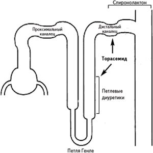 Как и другие петлевые диуретики, торасемид действует на восходящую часть петли Генле, где он ингибирует реабсорбцию натрия и хлоридов. В отличие от фуросемида, торасемид блокирует также эффекты альдостерона и, соответственно, в меньшей степени усиливает экскрецию калия . Это препятствует развитию гипокалиемии, которая является одним из главных побочных эффектов петлевых и тиазидных диуретиков.
