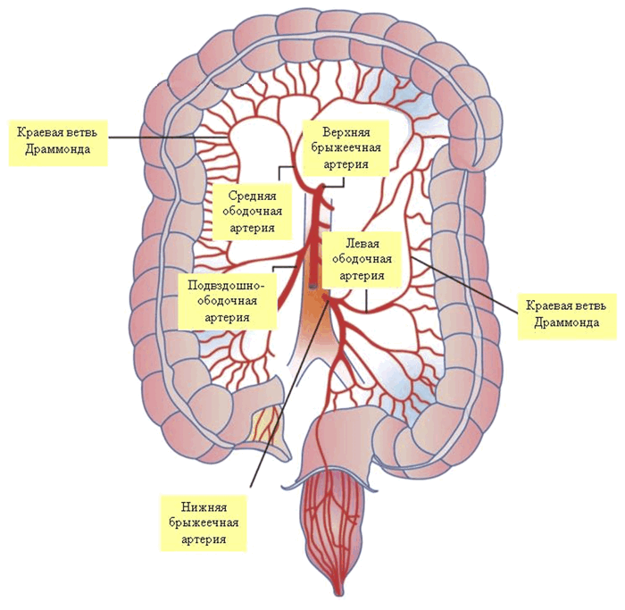 Ограничение кровотока на почве атеросклероза аорты и артерий толстой кишки может приводить к ишемии, особенно в левом изгибе и проксимальной части сигмовидной кишки.
