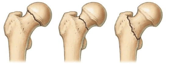 Слева-направо: субкапитальный, трансцервикальный, базисцервикальный переломы.