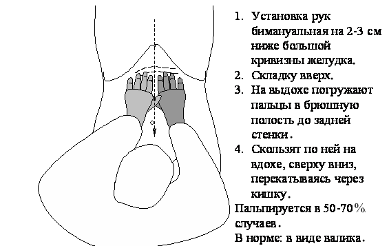 В том случае, когда кишка прощупывается трудно и у нас не складывается твердого убеждения, что прощупываемый нами одной рукой цилиндр действительно представляет собой отрезок поперечной кишки, мы всегда прощупываем кишку, пользуясь типичной билатеральной пальпацией. Образцов предлагает производить ее таким образом: „исследователь должен начинать ощупывание с уровня пупка, кладя обе руки его слегка согнутыми пальцами по обе стороны от пупка; затем пальцы продвигаются вверх и вниз.
