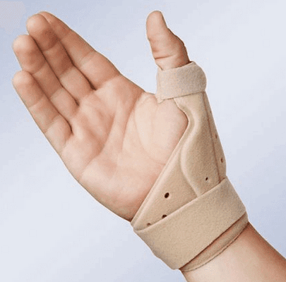 - Лучезапястный с фиксацией большого пальца. Ортез внешне напоминает браслет, который крепится на запястье, и имеет отдельно отходящую шину для фиксации большого пальца. Чаще применяется при повреждении связок в области проксимальной фаланги.