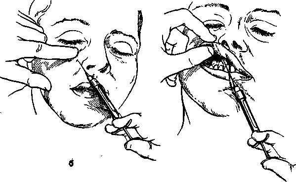 Обезболивающий препарат вводят с обеих сторон от носовой перегородки у основания. Для заморозки носонёбного нерва иглу также смазывают 1–2%-ным раствором дикаина.