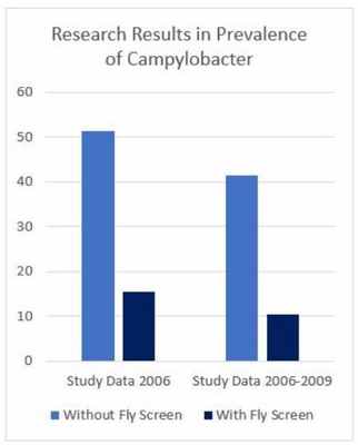 Однако эти результаты охватывают только одно лето и только один сезон года. Таким образом, чтобы предоставить более долгосрочные результаты, новая группа исследователей в дальнейшем решила исследовать годовое влияние сеток от мух в птичниках путем проведения исследования на основе набора данных за четыре года. Результаты это исследования согласуются с результатами, полученными в 2006 г., поскольку они выявили, что число больных кампилобактериозом бройлеров снизилось с 41,4% до 10,3%.