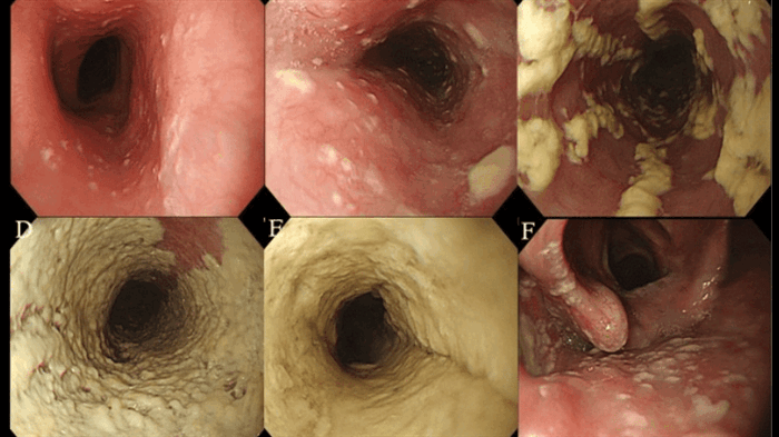 Эндоскопические признаки кандидоза пищевода — гиперемия и контактная ранимость слизистой оболочки, а также фибринозные налеты различной локализации, конфигурации и размеров. Среди всего разнообразия визуальных признаков кандидоза пищевода можно выделить три группы типичных изменений:
