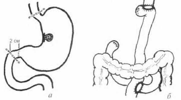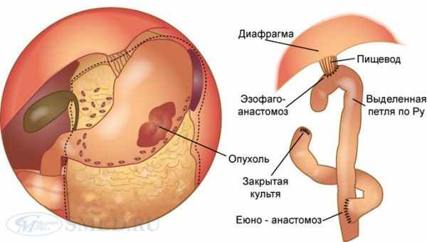Обычно удаляется весь желудок (гастрэктомия). Показанием к ней служит расположение опухоли выше угла желудка, субтотальном или тотальном поражении желудка.