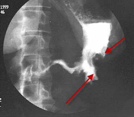 • рентгеноскопия желудка с пероральным введением контрастного препарата (сульфат бария). Один из основных методов определения локализации и протяжённости поражения стенки желудка. Наиболее важными рентгенологическими признаками рака желудка являются: