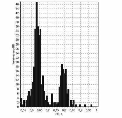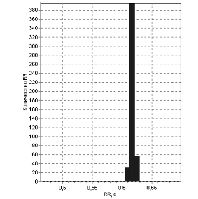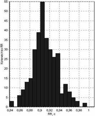 2. Гистография RR-интервалов (вариационная пульсометрия) - это способ изучения сердечного ритма, заключающийся в исследовании закона распределения величин RR-интервалов, как случайных величин в исследуемом ряду их значений. При этом строится вариационная кривая (вариационный ряд) или гистограмма и определяются различные ее характеристики. Эквивалентом термина «гистографический анализ» является вариационная пульсометрия. При построении гистограммы первостепенное значение имеет выбор способа группировки кардиоинтервалов, который должен соответствовать поставленной цели. Характер и форма гистограммы зависят от того, в каком диапазоне значений производится группировка и каков интервал группировки. Для правильной физиологической интерпретации интервал группировки должен рассчитываться исходя из частоты дыхания и частоты сердечных сокращений объекта. На основании методики Баевского, рассчитанной для человека и учитывающей физиологический смысл данного методического подхода, в вариационной пульсометрии имеет место группировка с интервалом в 0,05 с в диапазоне от 0,40 до 1,30 с; таким образом, выделяются 20 диапазонов значений кардиоинтервалов, каждый из которых имеет ширину в 50 мс (0,05 с).