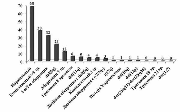 По результатам собственного анализа установлено, что чаще других у больных с de novo МДС встречались нормальный и комплексный кариотипы с повреждением 4 хромосом и более, редкие одиночные и двойные аберрации, делеция длинного плеча 5-й хромосомы и повреждения 7-й хромосомы (необходимо подчеркнуть, что речь идет о случаях с аномалиями 5-й и 7-й хромосом как единственном повреждении, выявленным стандартным цитогенетическим методом).