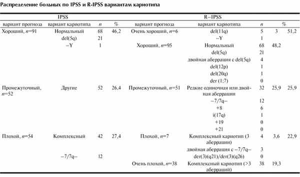 Наибольшее распространение получила IPSS [5]. Несмотря на многообразие цитогенетических повреждений, встречающихся у больных МДС, в IPSS приводится прогностический потенциал нормального и комплексного кариотипа и 4 аберраций. Все остальные повреждения, включая одиночные делеции, моно- и трисомии, транслокации и разные комбинации, объединены в группу промежуточного кариотипа.