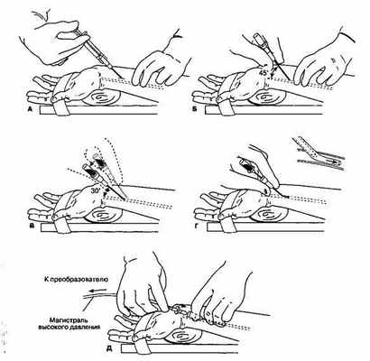 Ход манипуляции. Анестезия 1 % -ным раствором лидокаина. Кожа обрабатывается антисептиком и обкладывается стерильными марлевыми салфетками. Пункция осуществляется в месте пальпации пульса у дистального конца лучевой кости ангиокатетером (20-й калибр) под углом 45°. Необходимо срез его держать вверх и продвигать до появления крови из иглы. После этого ангиокатетер проводят для лучшего внутрисосудистого расположения еще на 2 мм, удерживая иглу. Затем отсоединяют иглу, пережимают пальцем проксимальный отдел лучевой артерии, присоединяют систему для инфузии и фиксируют катетер к коже с помощью шелковых швов.