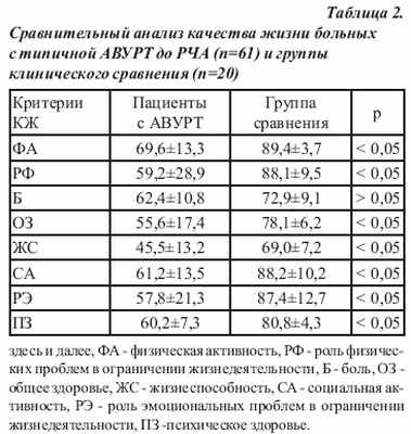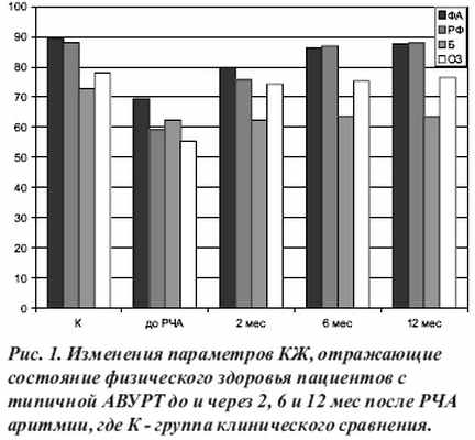 Через 6 мес после РЧА отсутствовали значимые различия между параметрами КЖ у больных с типичной АВУРТ и у практически здоровых лиц. Через 12 мес после РЧА полученные результаты изучаемых параметров КЖ показали, что физическая активность, роль физичес ких проблем в ограничении жизнедеятельности, общее здоровье, жизнеспособность, социальная активность, роль эмоциональных проблем, психическое здоровье пациентов с типичной АВУРТ были достоверно выше по сравнению с их же аналогичными параметрами до операции и не отличались от характеристик группы клинического сравнения.