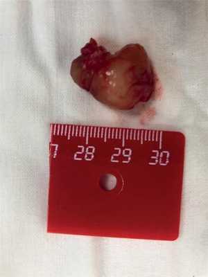 Рис. 3. Макропрепарат: опухоль неправильной формы, с гладкой поверхностью, плотноэластичной консистенции, в диаметре до 3 см.