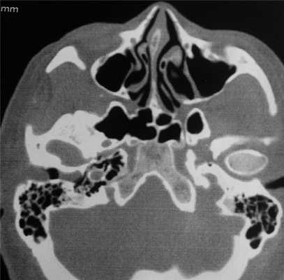 Описанная локализация опухоли встречается очень редко. Выявить ее до появления клинических симптомов крайне затруднительно. В установлении диагноза необходимо проведение КТ височных костей для определения объема оперативного вмешательства.