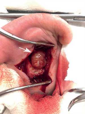 Хирургические особенности: эллипсоидная резекция предназначена для объединения карманов. Некоторые хирурги предпочитают широкое местное иссечение, подходя выше ушной раковины, для снижения вероятности рецидивов. Введение слезного зонда во вспомогательный тракт помогает при его идентификации. После выполнения разреза проводят диссекцию тканей, зонд может быть фиксирован путем сжимания окружающих мягких тканей. Проходят канал, избегая отклонения в медиальный отдел, обычно у хряща завитка. Необходимо избежать нарушения синуса и сохранить соответствующие ткани для забора образца.