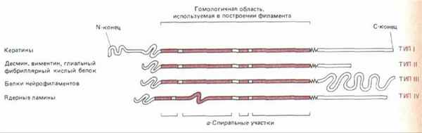 В состав промежуточных филаментов входит большая группа изобелков, родственных белков, которую можно разделить на четыре типа. Первый – кератины, кислые и нейтральные, встречающиеся в эпителиальных клетках; они образуют гетерополимеры из этих двух подтипов. Кератины, кроме того, имеют некоторую гетерогенность, зависящую от тканевого источника. Так, в эпителиях встречается до 20 форм кератинов, 10 форм других кератинов найдено в волосах и ногтях. Молекулярный вес кератинов колеблется от 40 до 70 тыс.