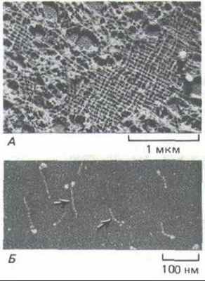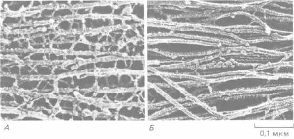 Рис. 11-77. Электронная микрофотография промежуточных филаментов двух типов, встречающихся в нервной ткани (препарат после быстрого замораживания и глубокого травления). А. Нейрофиламенты в аксоне соединены многочисленными поперечными белковыми сшивками; как полагают, такая организация придает этому длинному клеточному отростку большую прочность на разрыв. По-видимому, сшивки образованы длинными неспиральными участками С-концевой части наиболее крупного белка нейрофиламентов (см. рис. 11-74). Б. Промежуточные филаменты (называемые глиальными филаментами) в астроците. Они подвергаются меньшим механическим нагрузкам. Их поверхность довольно гладкая, и поперечных сшивок между ними мало. (С любезного разрешения N. Hirokawa.)