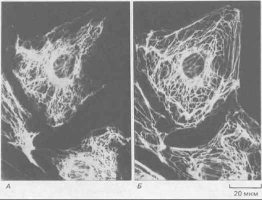 Если окрасить культивируемые клетки антителами к одному из цитоплазматических белков ПФ (например, виментину), то обычно будет видна ажурная сеть нитей, окружающая ядро и охватывающая всю, цитоплазму (см. рис. 11-73). По структуре эта сеть отлична от других компонентов цитоскелета, хотя местами ее нити, по-видимому, идут параллельно микротрубочкам цитоплазмы. Вероятно, организация цитоплазматических ПФ зависит от взаимодействия с микротрубочками, так как деполимеризация микротрубочек при обработке веществами типа колхицина ведет к «осаждению» всей сети ПФ в виде околоядерной «шапки». Можно думать, что многие ПФ цитоплазмы связаны с ядерной оболочкой и в норме оттягиваются от нее к периферии клетки микротрубочками, с которыми они соединены.