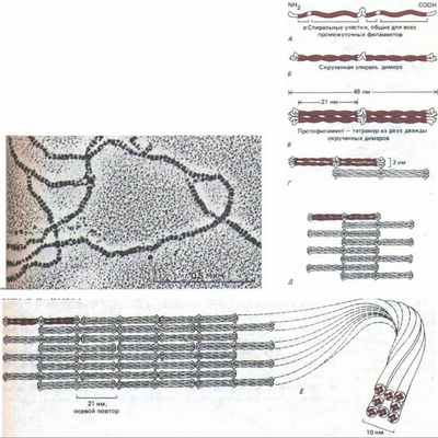 В отличие от мономеров актина и тубулина, которые представляют собой глобулярные белки, субъединицы ПФ имеют вытянутую, фибриллярную форму. Они объединяются в продольные пучки, где перекрываются по длине, так что образуют длинные нити с высокой механической прочностью. В латеральных взаимодействиях, за счет которых строятся ПФ, нередко участвует лишь часть молекулы белковой субъединицы ПФ, поэтому структура остальной ее части может значительно варьировать, не изменяя общего строения нити. В связи с этим ПФ в отличие от актиновых филаментов и микротрубочек построены из полипептидов с весьма различной молекулярной массой - от 40 до 130 тыс. в зависимости от типа клеток.