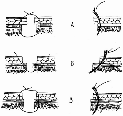5) при наложении шва необходимо сопоставлять ткани, обладающие сходной структурой. Сближение тканей различных структур приводит к формированию неполноценного рубца;