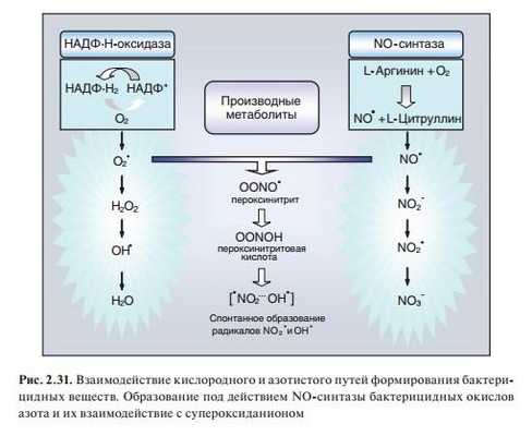 Считается, что начальным этапом в образовании биоцидных кислородных радикалов и метаболитов является восстановление молекулярного кислорода НАДФН-оксидазой с образованием супероксидного анион-радикала, который становится родоначальником других биоцидных соединений. Образовавшийся радикал кислорода не обладает бактерицидным свойством. Оно характерно для Н2О2, образующегося при дисмутации кислотного радикала и спонтанно.