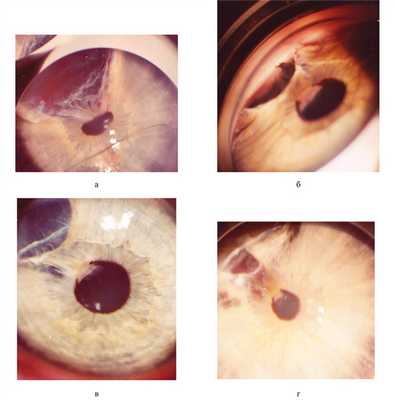 Проведена этапная лазерная цистодеструкция (рис. 2) Рис. 2. Глаз того же ребенка в возрасте от 3 до 5 лет в процессе этапного лазерного лечения. а — после 1-го сеанса; б — после 2-го сеанса; в — после 3-го сеанса; г — после 4-го сеанса. с помощью комбинированной лазерной установки (деструктор + коагулятор): Visulas-532S Combi («Zeiss», Германия) и YAG YC-1800 в комбинации с Диод GYC-1000 («Nidek», Япония). Обязательно использовали контактные линзы (Манделькорна и/или Гольдмана) для точной фокусировки лазерного луча и фиксации глаза ребенка. Этапное лечение за несколько сеансов, по нашему опыту, позволяет уменьшить суммарную энергию и легче переносится детьми.