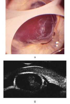 При осмотре левого глаза отмечена смешанная инъекция глазного яблока, посттравматический корнеосклеральный рубец на 10—12 часах, сращенный с радужкой. Объемная посттравматическая киста занимает верхненаружный сектор передней камеры (с 9 до 13 часов), закрывает практически весь зрачок, сращена с его краем и передней капсулой хрусталика. Радужка под кистой отсутствует как результат первичной хирургической обработки или вследствие иридолизиса, вызванного кистой. Содержимое кисты прозрачно, сквозь кисту видно сращение края зрачка с передней капсулой хрусталика на 10—11 часах, яркий рефлекс с глазного дна. Через зрачок, закрытый кистой, офтальмоскопия невозможна (рис. 1, а). Рис. 1. Глаз ребенка С. 3 лет с посттравматической кистой радужки и передней камеры, сращенной с хрусталиком, до лечения. а — биомикроскопическая картина; б — результат ультразвуковой биомикроскопии. Внутриглазное давление (ВГД) ОD — 18 мм рт.ст., ОS — 24 мм рт.ст. по Маклакову. Острота зрения — счет пальцев у лица при вынужденном положении головы.