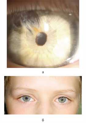 На первом сеансе кисту вскрыли ИАГ-лазером — прозрачное содержимое ее вышло в переднюю камеру (см. рис. 2, а). Признаков реактивного циклита после сеанса не было. ВГД в пределах нормы (перед сеансом ребенок получил стандартную подготовку: внутрь диакарб однократно, местно азопт однократно, индоколлир 3 раза в день перед операцией и 3 дня после нее). На следующих 3 сеансах (в возрасте ребенка от 3 до 5 лет) с интервалом от 1 мес до 1 года поэтапно ИАГ-лазером производили разрушение стенок кисты (как только элементы кисты начинали проминировать за пределы рубцовых изменений ее ложа) с лазерной коагуляцией ее рубцующихся остатков, которые «приваривали» к радужке (см. рис. 2, б—г). Первые 3 сеанса проводили под наркозом. Последний сеанс под местной анестезией был выполнен 7 лет назад. В течение последних 7 лет наблюдения признаков роста кисты нет. В верхненаружном секторе на месте бывшей кисты наличие плоских рубцовых изменений радужки (рис. 3, а, Рис. 3. Состояние глаза того же ребенка в возрасте 13 лет (через 10 лет после этапного комбинированного лазерного лечения гигантской посттравматической кисты радужки и передней камеры). а — биомикроскопическая картина; б — внешний вид ребенка. б). Имеющееся иридокапсулярное сращение на 11 часах не изменяется в течение 10 лет наблюдения. Хрусталик за пределами сращения сохраняет полную прозрачность. Глаз спокоен. После 3-го сеанса (в 5-летнем возрасте) достигнута и сохраняется до настоящего времени острота зрения 1,0, чего после радикальной блок-эксцизии вряд ли бы удалось добиться.