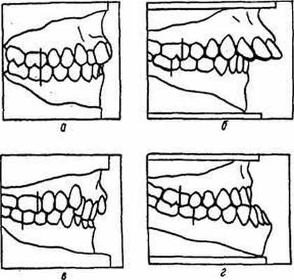 Рис. 1. Классификация аномалий прикуса по Энглю. о — нейтральный прикус (I класс); б — дистальный прикус (II класс — I подкласс); в — дистальный прикус (II класс—II подкласс); г — мезиальный прикус (III класс).