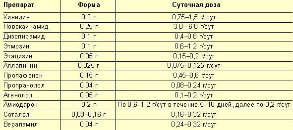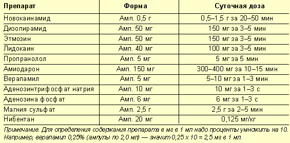 ‡ Дозировка амиодарона сильно варьирует; должна быть проверена инструкция от производителя по применению препарата. Как правило, пероральная нагрузочная доза при стабильных наджелудочковых аритмиях составляет около 5 г в течение 1-2 недель в дозе от 200 мг два раза в день до 400 мг 3 раза в день. Пероральная нагрузочная доза при желудочковых аритмиях составляет 10 г, которая достигается в течение 1-4 недель. Как правило, пероральная поддерживающая доза составляет 200 мг один раз в день, хотя 100 мг один раз в день можно использовать для пожилых или ослабленных пациентов, а 300 или 400 мг один раз в день можно использовать для профилактики серьезных желудочковых аритмий.