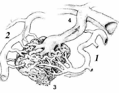 | Все артериовенозные мальформации (АВМ) имеют типичное строение: 1,2 - приводящие артерии(концевого и транзитного типов) 3 - клубок измененных сосудов(ядро) 4 - дренирующая вена | |