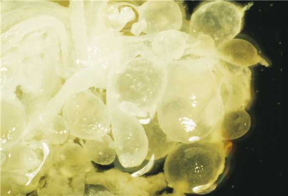 8. Гидропическая дегенерация. Это состояние, при котором плацентарные ворсины расширяются, содержание жидкости в них и в строме увеличивается, но гиперплазии трофобласта не наблюдается. Указанное состояние следует отличать от ПЗ, и оно не связано с увеличением риска ХК.
