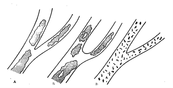 5. Характер ламинарного потока меняется и в связи с утолщением каждого слоя, возникают вихревые движения, устанавливается замедленный ток и закупорка просвета микрососуда.