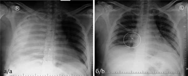 Пациент У., 23 лет, поступил 19.03.18 через 1 ч после полученного на улице ранения из пневматического оружия. Состояние при поступлении средней тяжести. Кожный покров бледной окраски, влажный. Аускультативно в легких везикулярное дыхание, значительно ослабленное справа. Насыщение крови кислородом 96%. ЧДД 20 в минуту, ЧСС 100 в минуту. АД 90/70 мм рт.ст., ШИА 1,11. На коже передней грудной стенки в пятом межреберье справа по краю грудины звездчатая рана диаметром около 0,4 см, с незначительным кровотечением. При УЗИ плевральных полостей в положении лежа выявлен правосторонний гидроторакс с разобщением листков плевры до 2,3 см. На обзорной рентгенограмме груди в прямой проекции правое легочное поле гомогенно интенсивно затенено на всем протяжении по причине гемоторакса. В проекции ThVIII определяется нечеткая тень неправильной формы (рис. 3, а). Рис. 3. Ранение правой половины груди из пневматического оружия у пациента У. а — равномерное среднеинтенсивное затенение правого гемиторакса (гемоторакс 2500 мл), нечеткая тень инородного тела в проекции ThVIII; б — инородное тело в проекции корня правого легкого — деформированная расширительная пуля от пневматического оружия (обведена). Левое легочное поле прозрачное, тень средостения смещена влево.