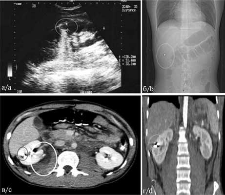 Пациент З., 23 лет, поступил в операционное отделение без предварительного обследования в приемном отделении 27.07.12 в 16:30, через 1 ч после ранения, полученного на улице. Состояние тяжелое, в сознании, вынужденное положение на правом боку. Предъявлял жалобы на боли в животе, общую слабость, головокружение. АД 110/70 мм рт.ст., ЧСС 120 в минуту, ШИА 1,09. На боковой стенке живота слева по передней подмышечной линии под реберной дугой рана размером 0,3×0,3 см, без эмфиземы, с незначительным кровотечением. Живот вздут, болезненный во всех отделах, положительные симптомы раздражения брюшины. При рентгенографии груди и живота легочные поля прозрачны, газ, жидкость не определяются. Контуры аорты четкие. В проекции правого подреберья определяется инородное тело — пуля от пневматического оружия. При УЗИ, выполненном на операционном столе, в брюшной полости выявлена свободная жидкость во всех отделах, в полости малого таза — до 5 см. Почки подвижны, топография их обычная. Правая почка размером 12,1×5,2 см, левая размером 10,8×4,8 см. Паренхима шириной 1,9×2 см средней эхогенности с гипоэхогенными пирамидками. Чашечно-лоханочная система не расширена, справа удвоена. С обеих сторон определялись эхосигналы расцененные как конкременты размером от 0,2 до 0,8 см (рис. 2, а). Рис. 2. Слепое пулевое ранение живота из пневматического оружия у пациента З. а — УЗИ, линейный эхосигнал (обведен) в правой почке, б, в, г — СК-томограмма. а — расширительная пуля в проекции правого подреберья (обведена); в — аксиальный срез, инородное тело (обведено черным), паранефральная гематома и экстравазация контрастного вещества (обведено белым); г — фронтальная реконструкция, инородное тело в правой почке (обведено). Забрюшинная клетчатка неоднородная из-за кровоизлияния.