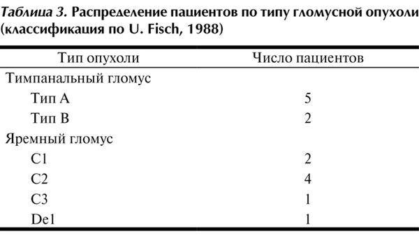 Таблица 3. Распределение пациентов по типу гломусной опухоли (классификация по U. Fisch, 1988)