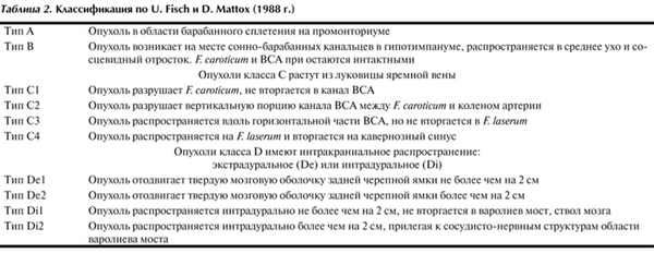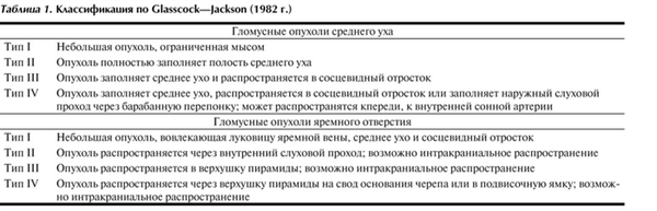 В настоящее время используются две обширные классификации гломусных опухолей, по Glasscock—Jackson [20] (табл. 1) и U. Fisch и D. Mattox [21] (табл. 2).