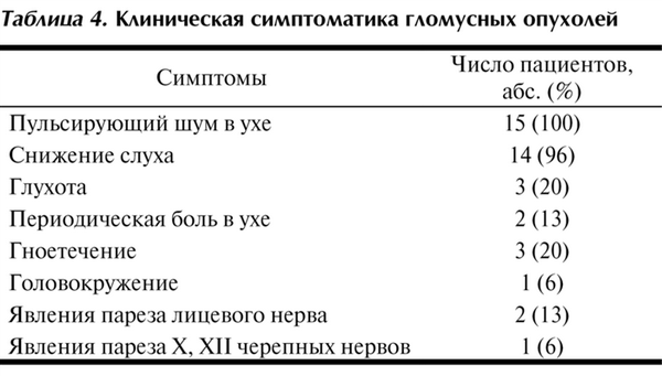 Таблица 4. Клиническая симптоматика гломусных опухолей