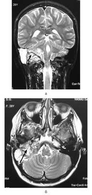 МРТ основания черепа. Гломусная опухоль c распространением в заднюю черепную ямку (стрелки). а — коронарная проекция; б — аксиальная проекция.