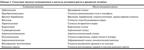 Таблица 1. Гломусные опухоли (хемодектомы) и места их исходного роста в организме человека