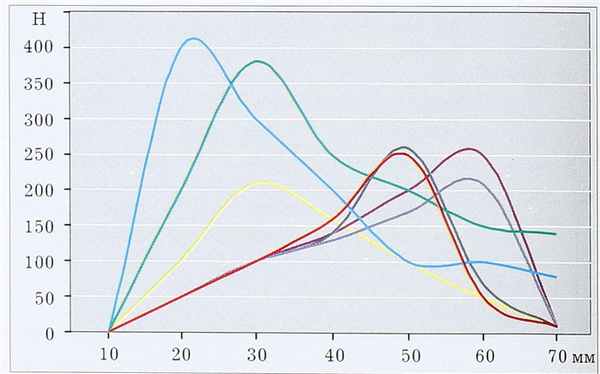 Рис. 2. Результаты нагрузочного теста.По оси абсцисс — смещение позвонков (в мм), по оси ординат — величина усилия (в Н). (фиол) — перелом зубовидного отростка типа 2; (красн)— перелом зубовидного отростка типа 3; (бардовый)— типичный перелом «палача»; (сер)— атипичный перелом «палача»; (желт)—перелом Джефферсона; (зел)— перелом затылочного мыщелка; (голуб) — разрыв диска С2-СЗ.