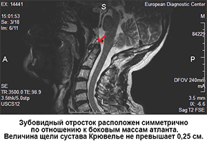 Диагностировать малейшие аномалии уже на начальной стадии возможно благодаря выполнению исследования МРТ краниовертебральной зоны в трёх проекциях с толщиной срезов не более 3 мм на высокопольном томографе мощностью 1,5 Тесла. При этом врачом во время процедуры используются протоколы T2 COR, T1 COR, T2 Sag, STIR, Ax T1, Ax T2 FatSat (с жироподавлением).