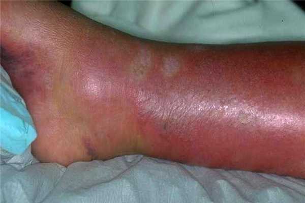 Если заболевание вызвано рожистым воспалением, то в пораженной области резко возвышенного болезненного валика может возникать чувство жжения, покраснения (эритема), повышение температуры, мелкоточечные кровоизлияния, эрозии, трофические язвы, пузырьки, которые могут спадать, образуя бурые корочки.