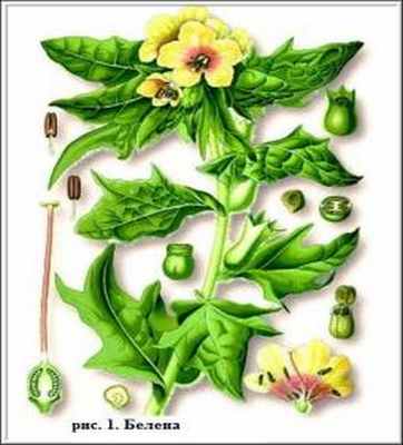 Проявляется в виде повышенного возбуждения, усиления кровообращения и дыхания, появления судорог. К этой группе относятся: Белена черная -- Hyoscuamus niger L. ( рис.1). Относится к семейству пасленовых. Двулетнее травянистое растение высотой 30--100 см, с неприятным запахом. Корень ветвистый, стержневой. Стебель прямостоячий, густо покрытый мягкими клейкими волосками. Листья крупные, очередные. Цветки средней величины, грязно-желтые, с более или менее заметными темно-фиолетовыми жилками. Цветет в июне--июле, семена дозревают в августе--сентябре. В диком виде белена встречается около речек, на залежах, пустырях, в мусорных местах, вблизи жилья, у дорог. Широко распространена почти по всей России, за исключением таежной (северной) части Сибири. Введена в культуру в специализированных (лекарственных) совхозах Новосибирской и Воронежской областей. Во всех частях растения содержатся алкалоиды гиосциамин, атропин, скополамин. В листьях их до 0,1 %, в стеблях 0,02, в корнях 0,15--0,18 %. Кроме того, белена содержит белковые вещества, сахар, камедь, жирное и эфирное масла и др.